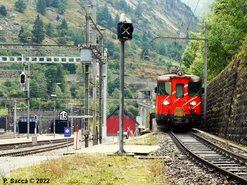 | Sopra : Goschenen, 18.09.1981; Deh 4/4 52 "Tujetsch-Sedrum" + ABt 4152; la linea scavalca, nel suo raccordo verso lo scalo merci, l'ingresso del portale nord della galleria del Gottardo delle FFS. | |||||