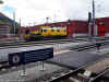 Sopra : Samedan, agosto 1988 --- Ge 4/4 II 615 -- ABDe 4/4 501 + BDt 1721-- Ge 3/3 214 -- deposito, linee verso Pontresina / St. Moritz, pannello locale "Integra". |